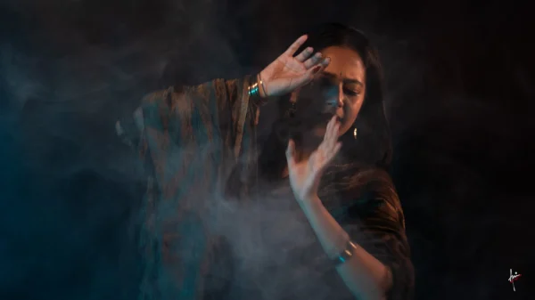 This photoshoot explores the interplay of light, texture, and expression. Aged frames embrace fleeting moments, fabrics flow like whispers of memory, and illumination reveals layers of untold stories. At the heart of it all is Vasu – her expressions subtle yet bold, striking in their depth and authenticity. She becomes the thread that binds the elements, a living canvas embodying both stillness and intensity, weaving a narrative that lingers in the spaces between presence and possibility