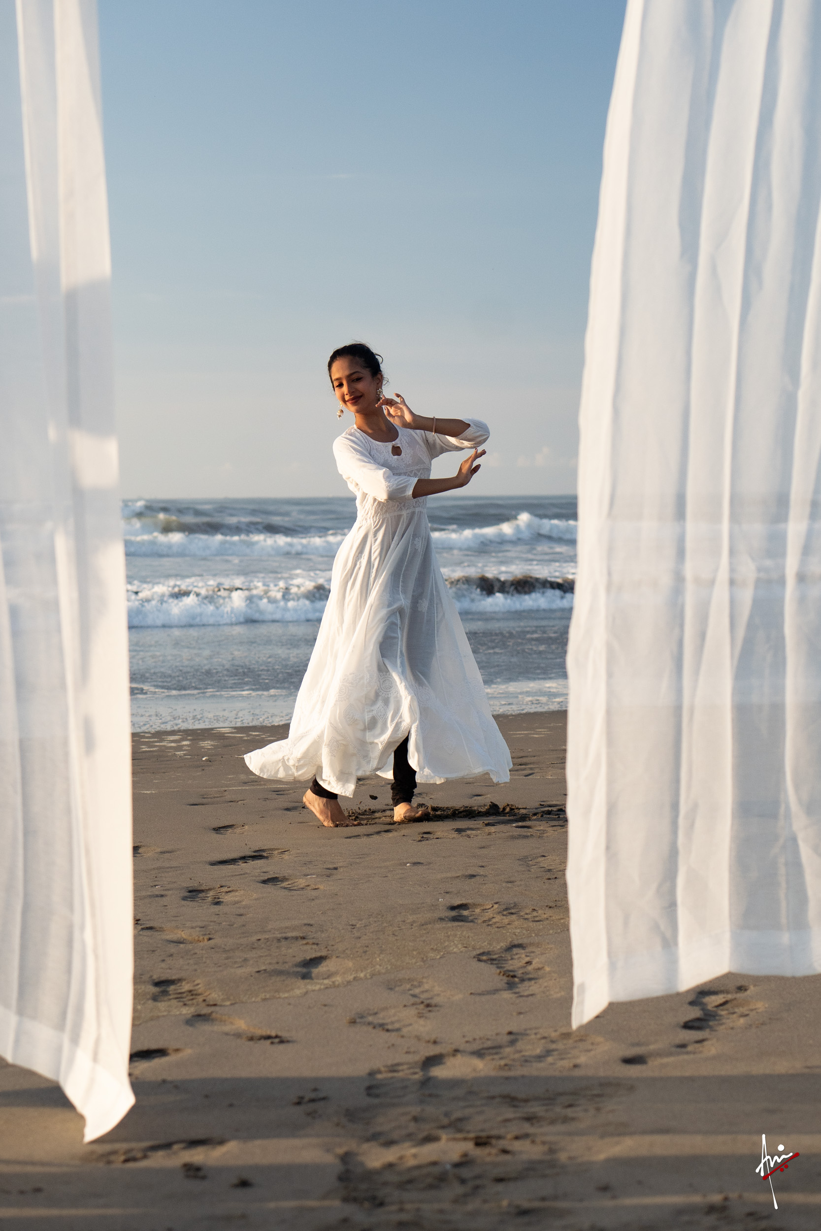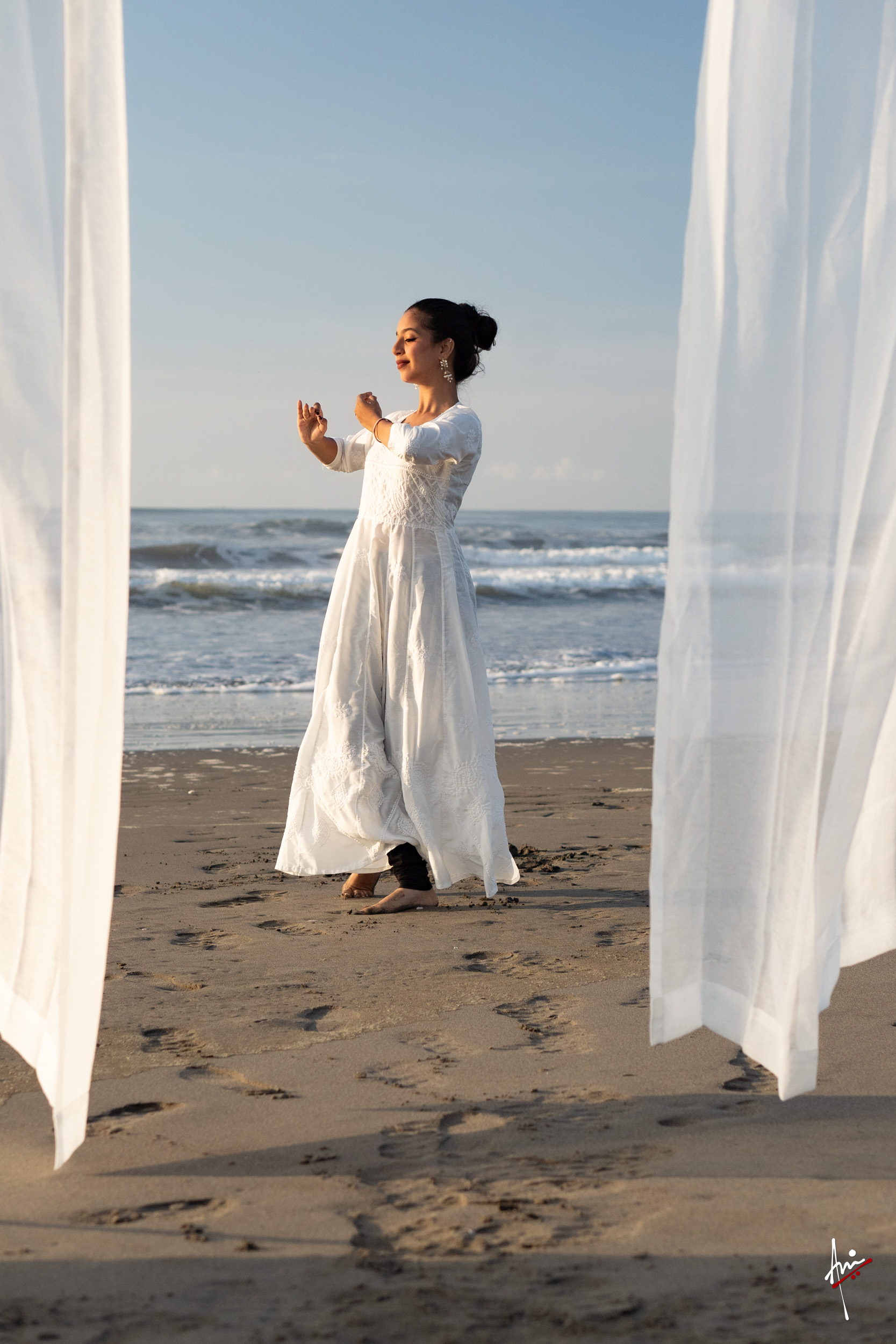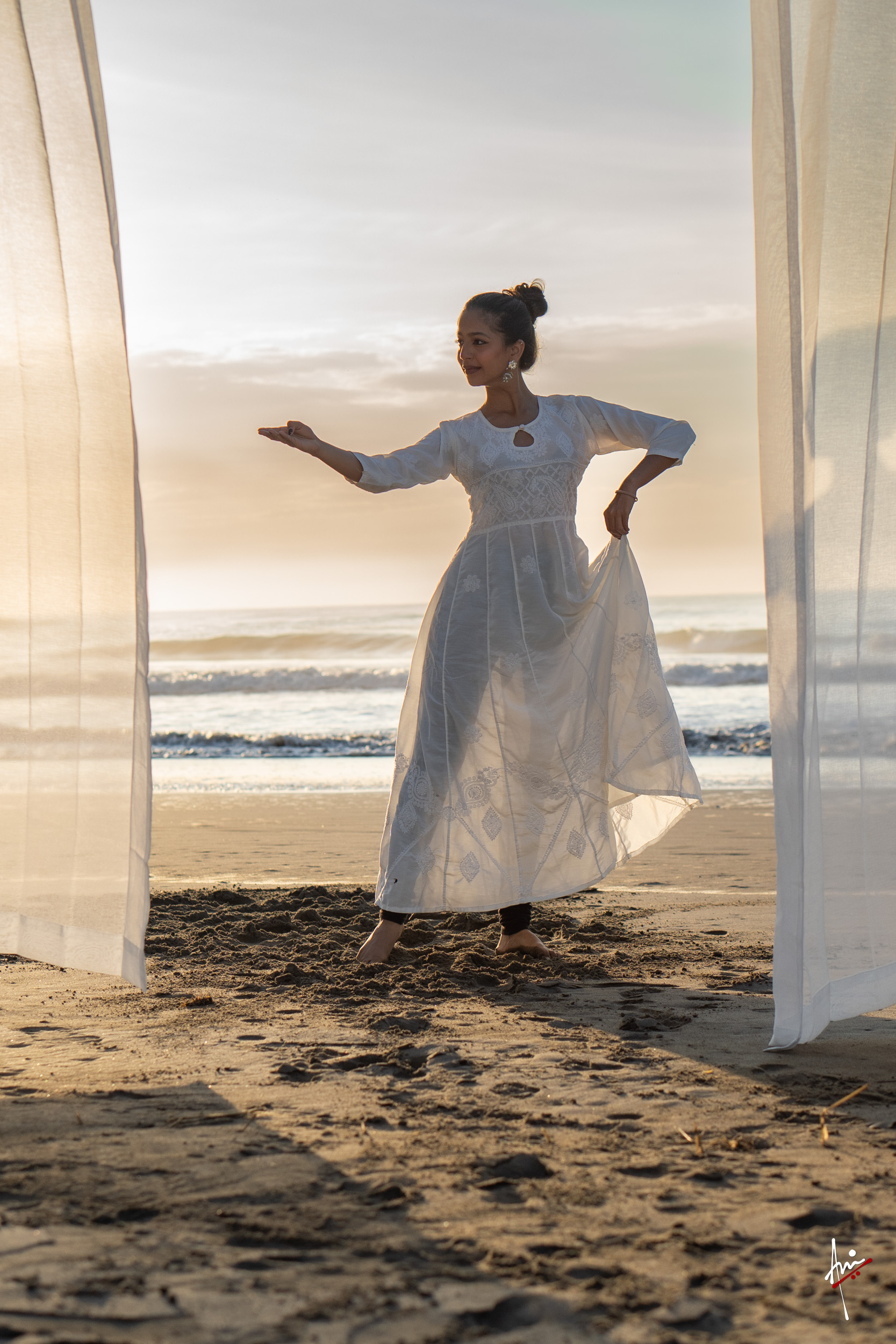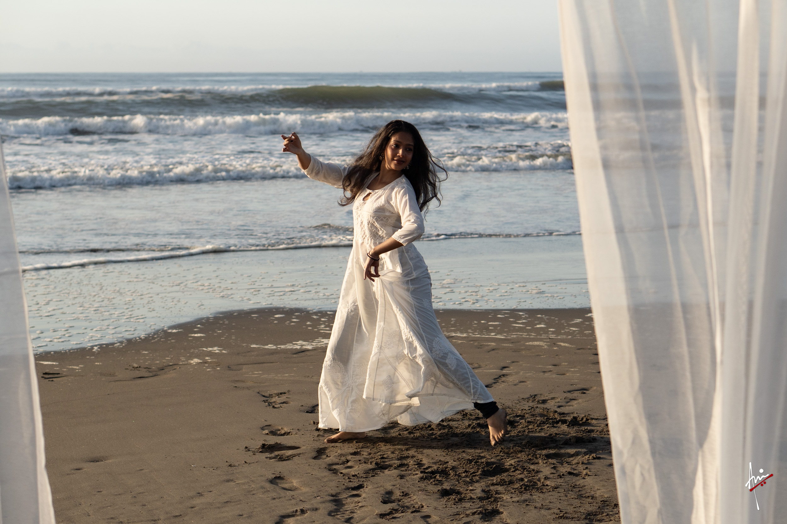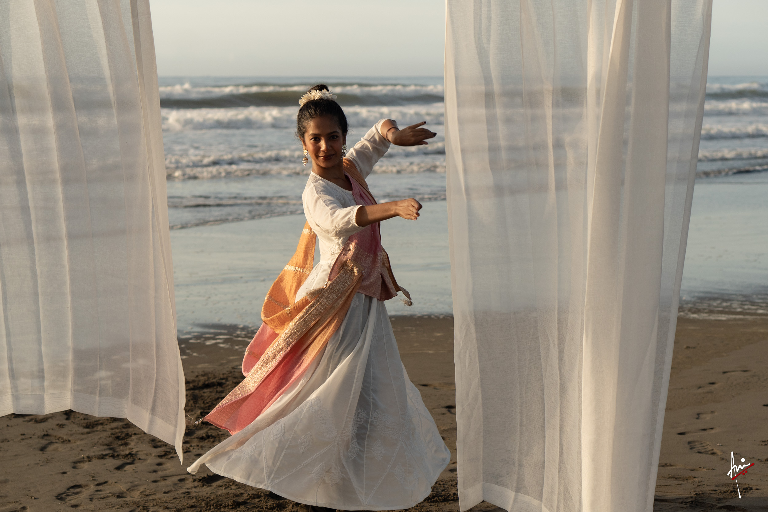 The photoshoot with Vasu, a young Kathak dancer, at Kujukuri Beach in Chiba, Japan, captures the serene beauty of the rising sun in the early morning. The soft hues of dawn blend seamlessly with the vast expanse of the ocean and the rhythmic dance of the waves. Against this natural backdrop, Vasu’s classical Kathak dance form comes to life, showcasing her grace, impeccable posture, and artistic flair. Her movements harmonise with the gentle ebb and flow of the sea, creating a captivating visual narrative that celebrates both the tranquillity of nature and the timeless elegance of Kathak.