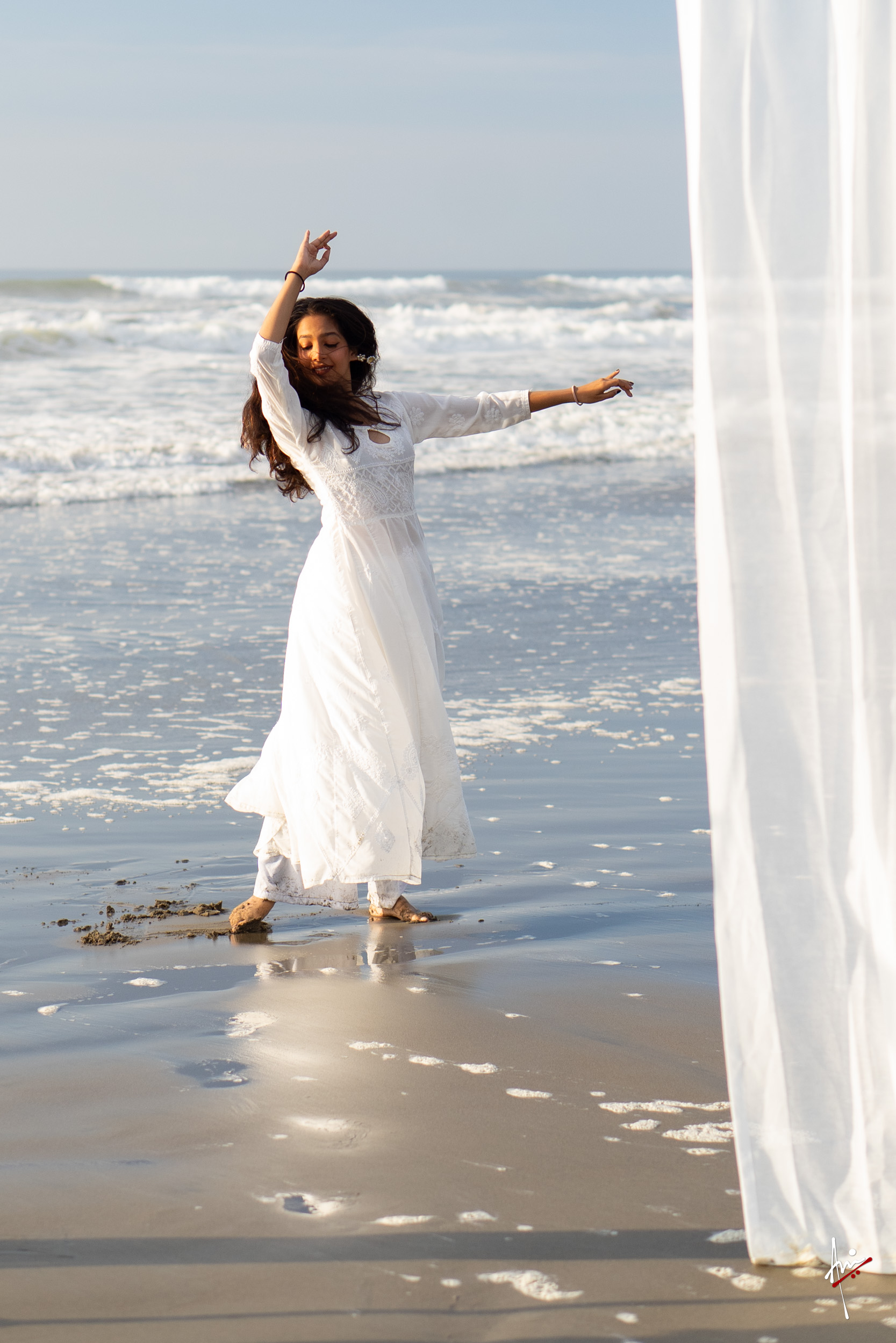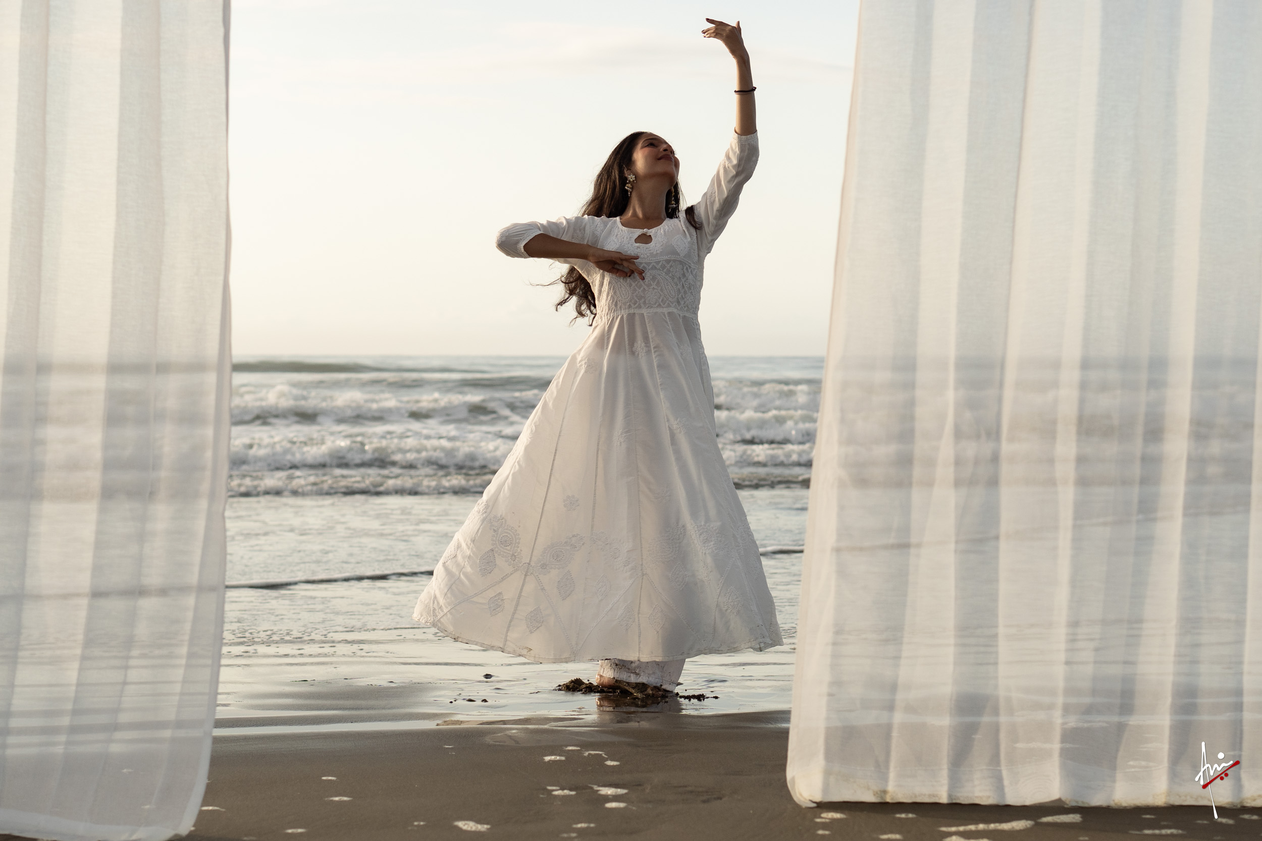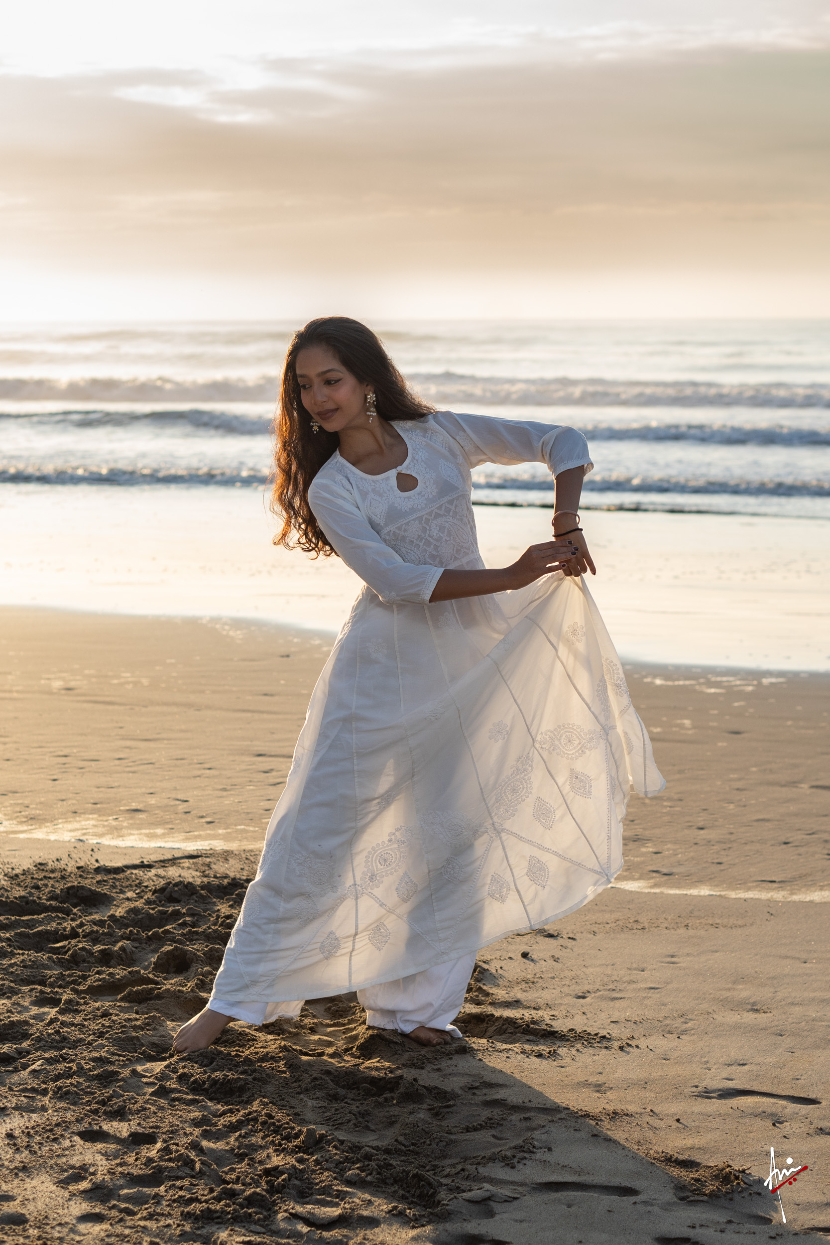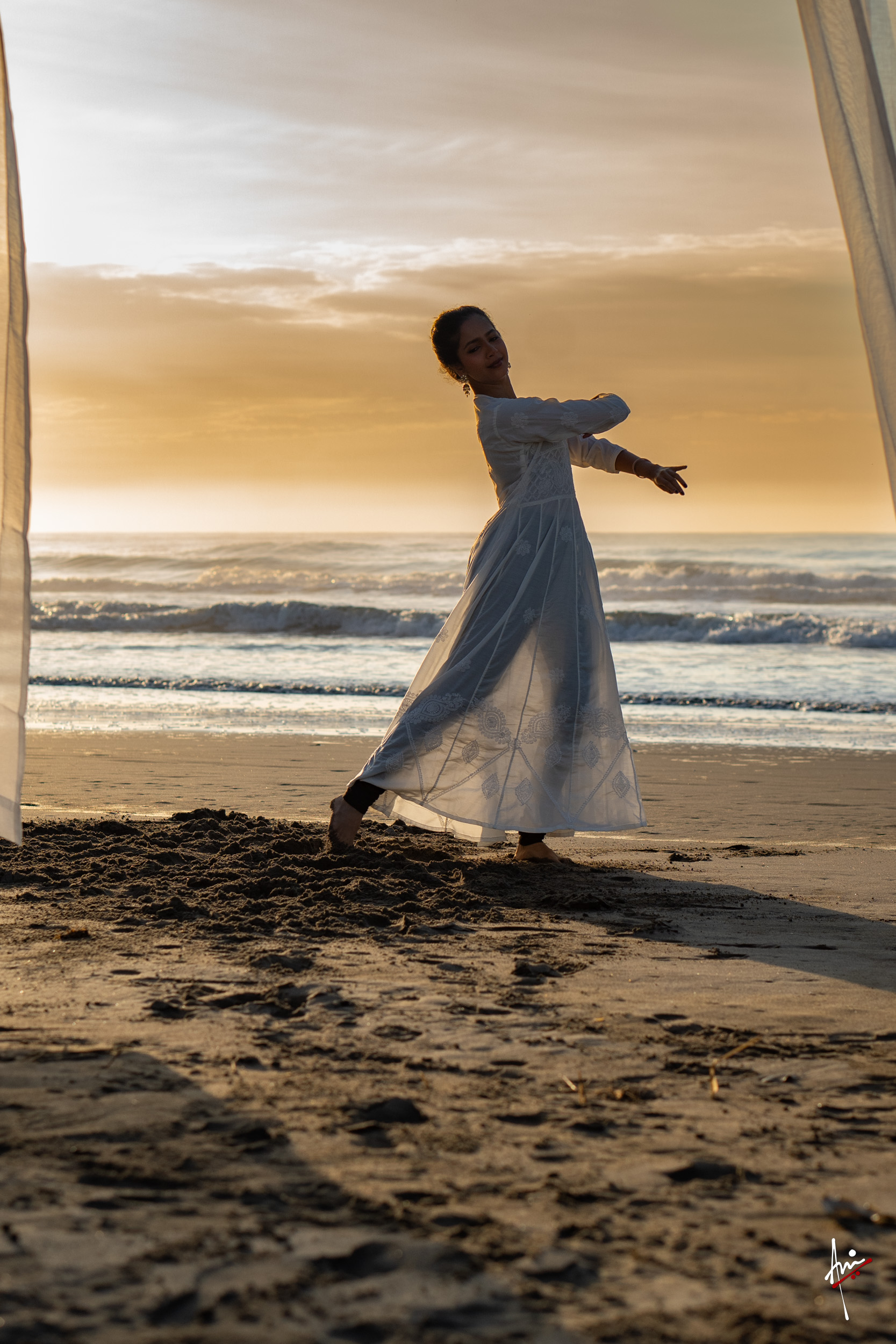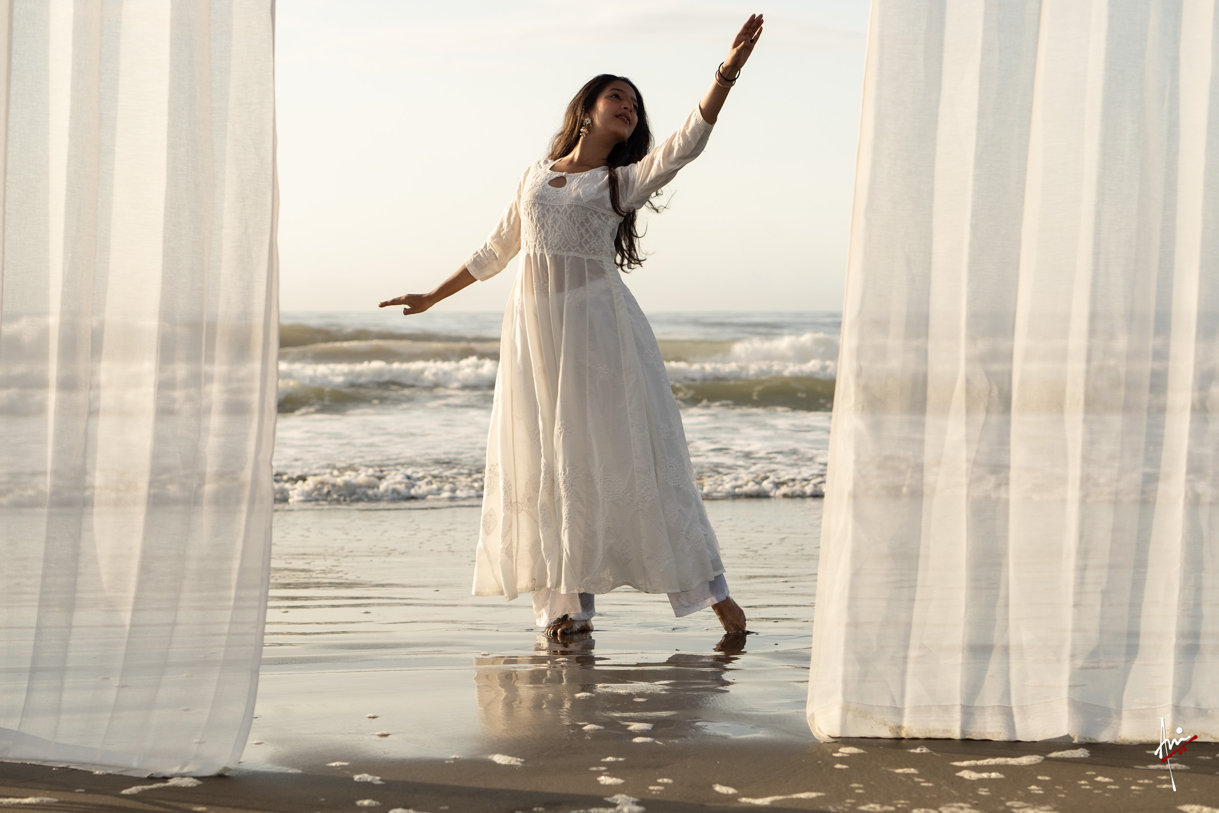 The photoshoot with Vasu, a young Kathak dancer, at Kujukuri Beach in Chiba, Japan, captures the serene beauty of the rising sun in the early morning. The soft hues of dawn blend seamlessly with the vast expanse of the ocean and the rhythmic dance of the waves. Against this natural backdrop, Vasu’s classical Kathak dance form comes to life, showcasing her grace, impeccable posture, and artistic flair. Her movements harmonise with the gentle ebb and flow of the sea, creating a captivating visual narrative that celebrates both the tranquillity of nature and the timeless elegance of Kathak.